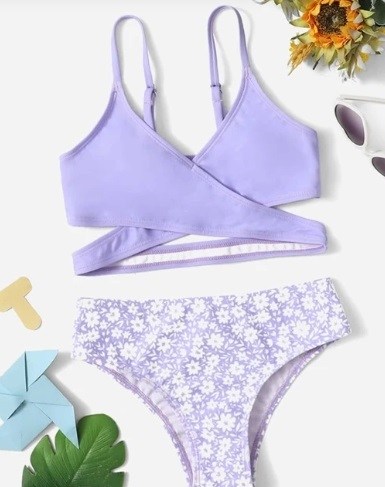 Queremos mostrarte diversidad. Y estamos seguras de que a las chicas les va a encantar el bikini cruzado que vamos a mostrarles. Es de Shein y tiene un color muy bonito lila, acompañado de un estampado de flores en la braguita.