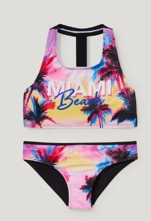 En C&A también encontramos bikinis para adolescentes, como este diseño Miami Beach en color rosa con motivos en tonos azules, rosas y amarillos. Muy alegre, femenino y vistoso. Piezas en licra XTRA LIFE™ que es muy resistente al cloro o a las cremas y protectores solares que utilizamos. Y es que las adolescentes deben acostumbrarse a ponerse protector solar siempre que vayan a tomar el sol y a renovarlo con frecuencia para que su protección sea efectiva.
