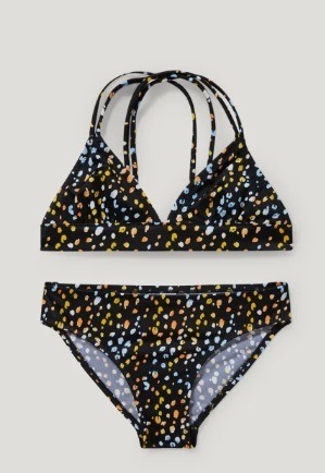 Otra alternativa en cuanto a bikinis pueden encontrarlo las adolescentes en este modelo de C&A, en color oscuro y con lunares en tonos claros que van desde el celeste al ocre. Nos recuerda al firmamento lleno de estrellas. Es un color más discretos, para las chicas más tímidas o que quieren diseños más de adultas.