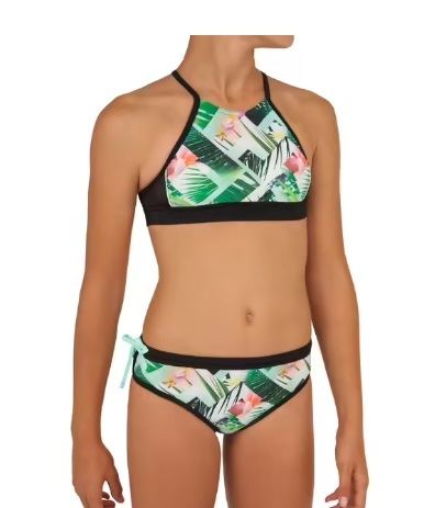 Otro de los modelos que proponemos está también en Decathlon y es el Baha 900 Decathlon. Es un bikini para la chica adolescente porque trae espuma para evitar transparencias, aunque esta espuma se puede extraer si resulta molesta. Además de aportar comodidad a la niña, también le proporciona sujección, la suficiente para que la chica pueda nadar o surfear disfrutando del agua.