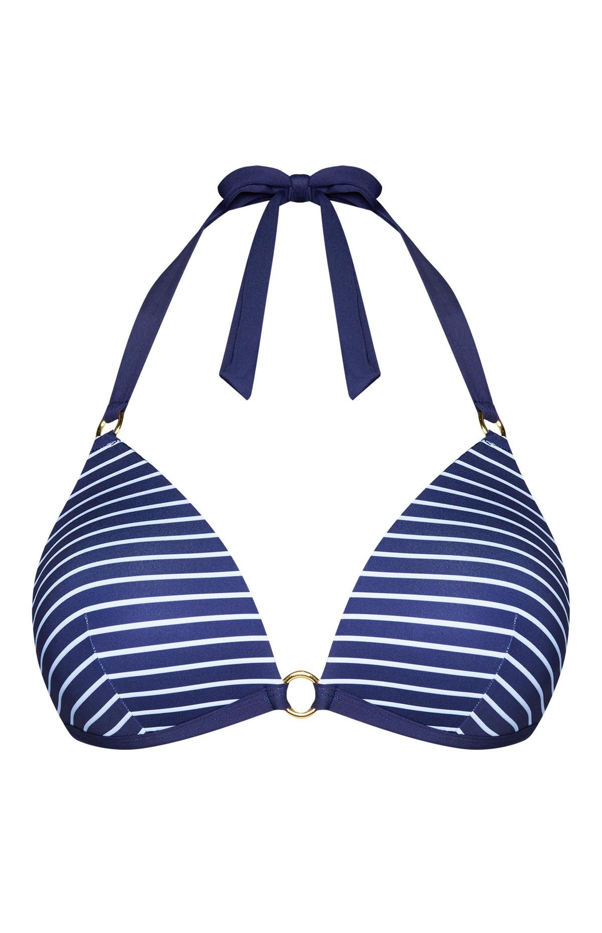 El bikini triángulo, un clásico de todas las playas del mundo, ideal para todo tipo de cuerpos. Entre los distintos modelos al respecto podemos destacar este bikini que veis arriba, que cuenta con un bonito color azul marino y además, con esos detalles de lazos y como no, el cuello halter que marca tendencia.
