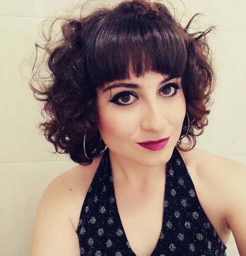 Pelo rizado corto y flequillo como tú quieras. Nos vale un flequillo con rizos o un alisado como el de la fotografía. Mira qué elegante quedó el look.