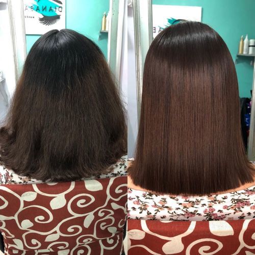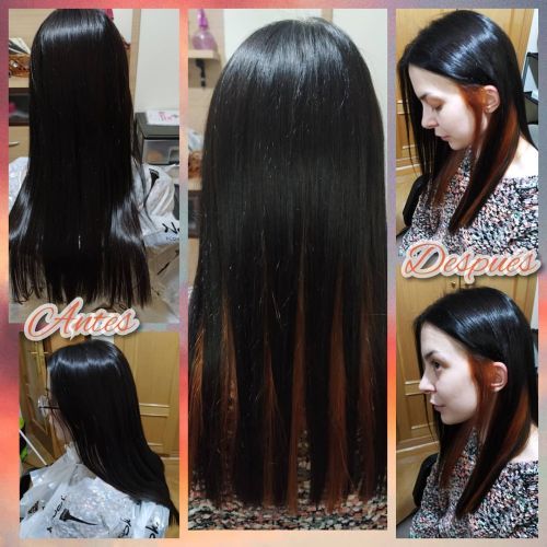 Imagen tomada del perfil de Instagram de kb_centro_de_bellezaLa combinación corte más color es una buena idea. Como esta melena oscura+cobriza con corte recto.