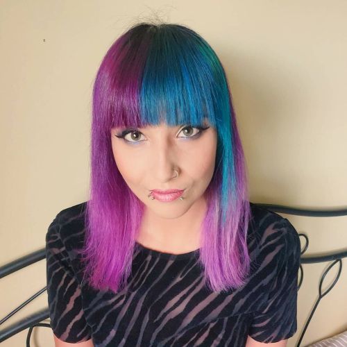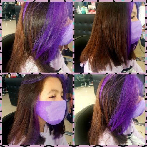 Y apostando por el color, un corte recto para media melena con mechón frontal en morado.