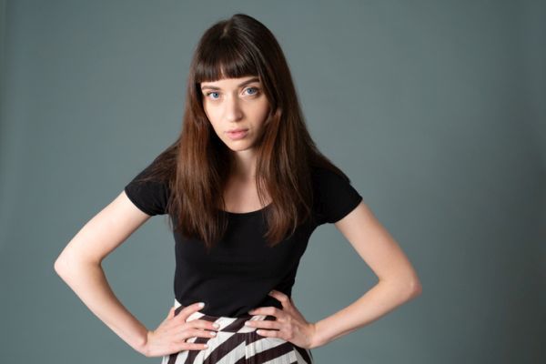 Un cabello muy desfilado en melena corta con flequillo tupido y recto.