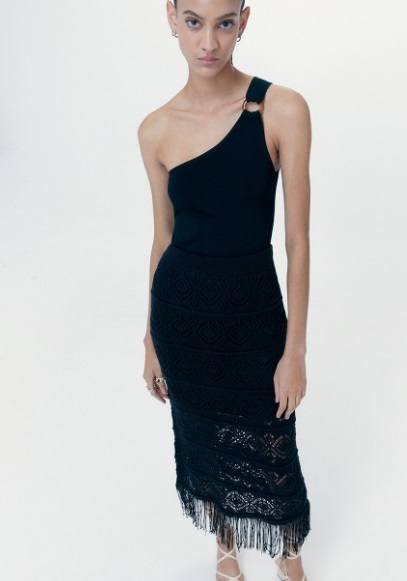 Dice el protocolo que no debe vestirse de negro para una boda. Pero si la celebración tiene lugar por la tarde o, sencillamente amas el color negro, ¡qué demonios! Con este modelo te verás divina. Además, es un diseño sensual el de esta falda calada con flecos que podrás llevar a juego bien con otros colores o con un body también oscuro.