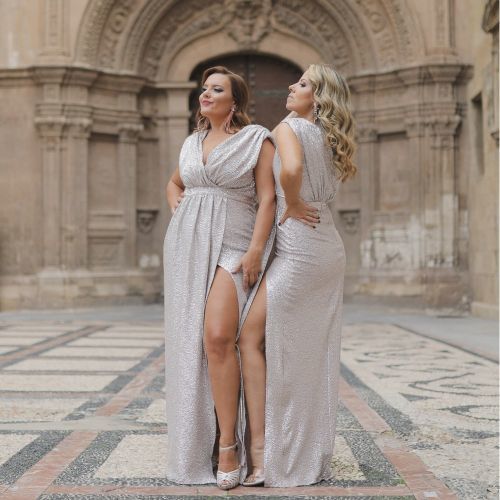Otro vestido en talla grande para invitadas a bautizos en es el modelo GUIRNALDA. Con corte imperio y en color dorado, tiene una abertura lateral super sexy.