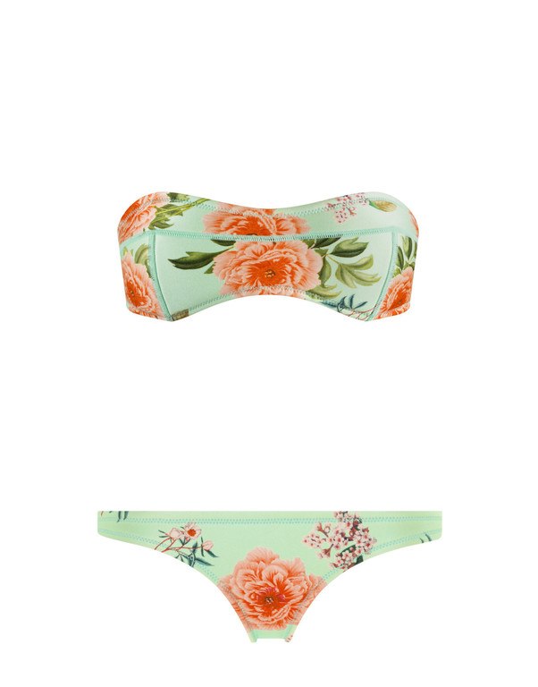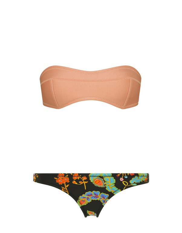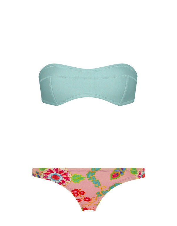 Este bikini bandeau utiliza el famoso estampado tropical en colores flúor mezclados entre sí ¿te animas con él?