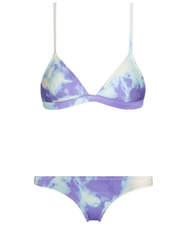 Este bikini tiene un estampado difuminado en varios tonos azules y blanco como a pequeñas pinceladas de color.