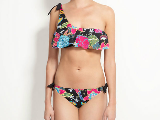 Este bikini tiene un estampado muy divertido con flores de colores que alegran el bikini en negro. Además el corte asimétrico y el volante favorece a chicas con poco pecho.