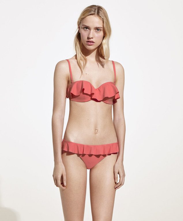 El coral es un tono que se llevó mucho durante el verano del año pasado. En este año también se lleva muchísimo de modo que no lo dudes y luce un bikini como este que veis arriba y que Oysho también nos presenta con la tendencia de los volantes.