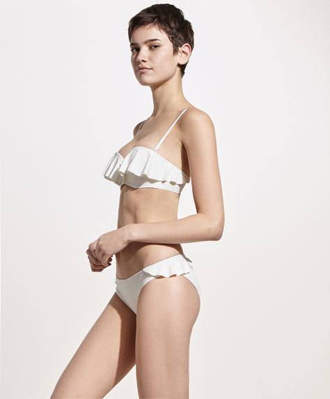 Junto a las mencionadas tendencias del uso de volantes y flecos, y formas como el top de cuello halter, podemos aconsejaros también que apostéis por bikinis que cuenten con pliegues o un pequeño fruncido tal y como vemos en el modelo de arriba, que de nuevo y como ya vimos anteriormente, se presenta en color blanco.