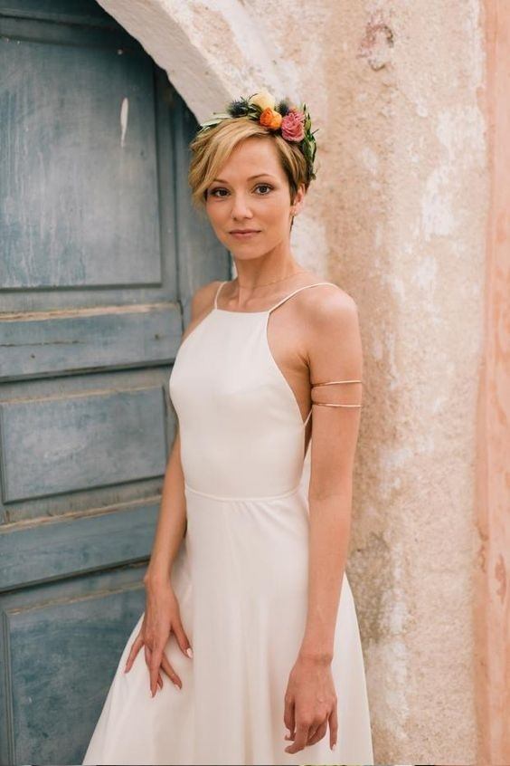Si quieres sentirte como una diosa griega, las coronas de flores son la mejor opción, siempre en un tono informal. Como véis no hay escusa, ya que si en la imagen anterior habíamos visto una melena corta con corona de flores. En esta ocasión podéis apreciar lo bien que queda, con un corte de pelo corto. Para este tipo de peinado y adorno, un vestido de cuello tipo halter como el de la imagen o bien un escote tipo corazón, serán el complemento ideal para un día tan especial.