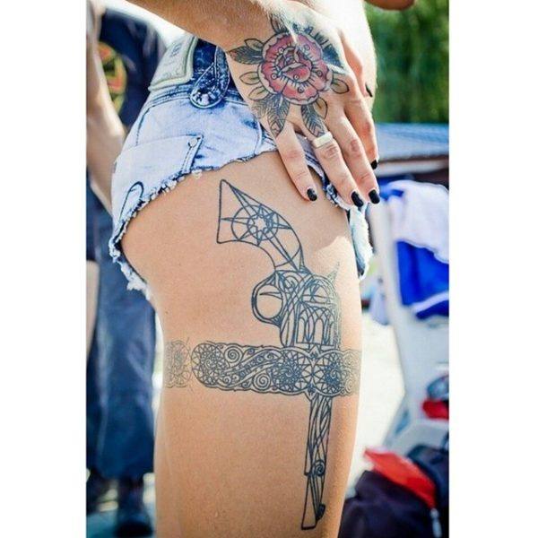 También podéis decantaros por un diseño de tatuaje de pistola que es otro de los elementos que no pueden faltar entre los tatuajes chicanos. Para un estilo mucho más femenino y sensual, nada como decantarse por un tatuaje como este que cuenta con una pistola y un dibujo de encaje.