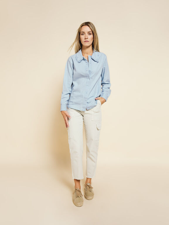 Para aquellas que os guste algo más desenfadado está esta camisa de color azul con cuello bebé que me ha llamado mucho la atención. Está confeccionada en 100% algodón y tiene botones blancos veteados.