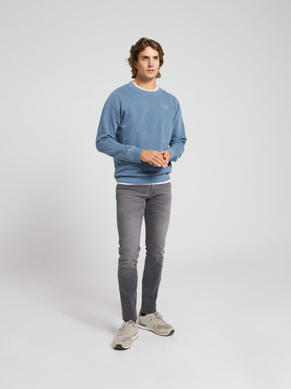 Esta sudadera clásica garment dye de color azul está confeccionada en 100% algodón y cuenta con el tradicional bordado de raquetas en el torso, además de añadirle un bordado de letras Silbon en gris en la manga. Es ideal para looks casual o incluso desenfadados.