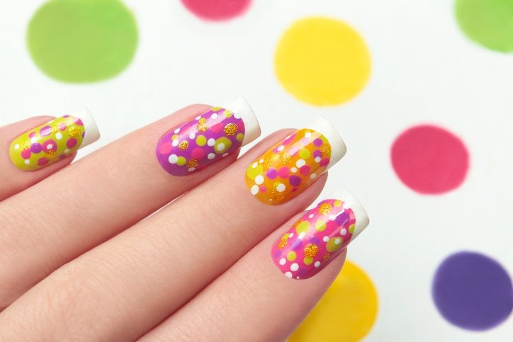 El segundo ejemplo nos muestra una explosión de color a través de puntos de colores sobre una base de pintauñas también con un color muy potente. En este caso hemos optado por una base distinta para cada uña (amarillo, rosa, naranja, morado) pero puedes elegir una misma base para todas si lo prefieres. Los puntos los puedes hacer con un palito fino que te ayude y basta con dejar volar tu imaginación y los diferentes colores.