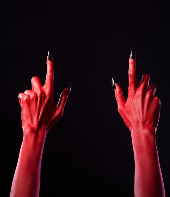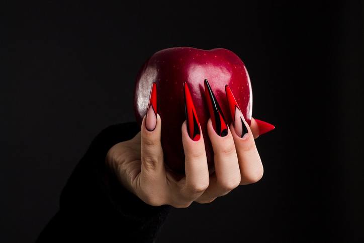 El segundo ejemplo es uno de nuestros diseños de uñas carnaval favoritos porque no solo implica a las uñas sino que también traspasa a las manos y a los brazos lo que le da un toque muy realista. Al igual que en el ejemplo de arriba, lo único que tenemos que hacer es usar unas uñas postizas negras y largas y después, con pintura para piel, pintamos nuestras manos y brazos con rojo o con verde para darle ese aspecto de bruja que buscamos. También te puede servir si tu disfraz es de diablesa.