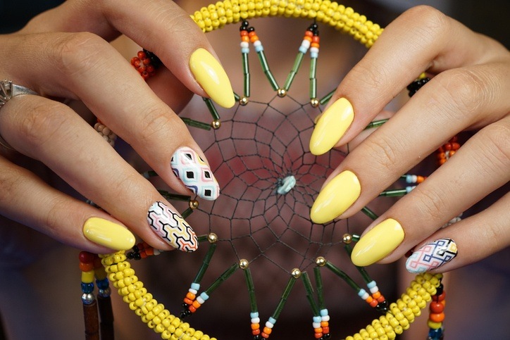 El segundo ejemplo que te hemos mostrado nos encanta porque tiene unos colores perfectos para el carnaval: amarillo y negro. Además, cada uña tiene un diseño diferente lo que hace que esta manicura sea tan especial.