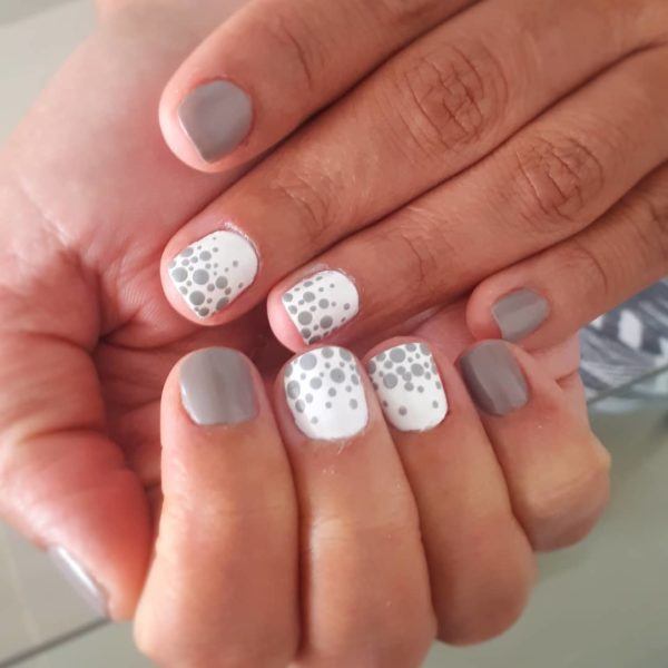 Por último, para acabar con nuestras propuestas de diseños de uñas con puntos 2020, queremos hablaros también de las uñas cortas. De hecho unas uñas cortas con lunares o puntos serán también tendencia, y entre las muchas propuestas que os podemos mostrar al respecto, nada como decantaros por un diseño como este que vemos a continuación en el que se combina el color blanco con el color gris. De este modo podéis lucir un estilo ideal para el día a día o también, para ocasiones que sean especiales.