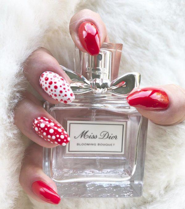 Por otro lado, los dibujos asimétricos son también tendencia, y de este modo, los podemos crear con lunares o puntos como en esta otra propuesta que vemos a continuación, con una base de esmalte en blanco y con puntos en color rojo o viceversa.