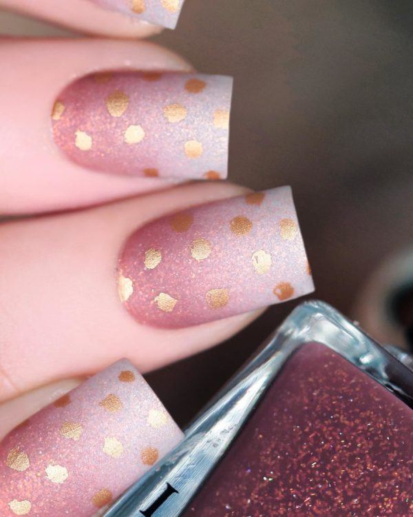 Entre los diseños de uñas con puntos 2020, nos podemos decantar también por la tendencia del glitter que aportará a estas un brillo especial. Entre los muchos diseños al respecto, podemos decantarnos por algo como esta propuesta, con un esmalte de glitter rosado, añadiendo además el dibujo de lunares dorados, para una manicura elegante y con mucho estilo.
