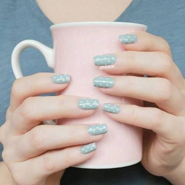 Por otro lado, gracias a las uñas con puntos 2020 podemos llevar también dibujos que marquen tendencia. De este modo, podéis crear dibujos de líneas, como en esta propuesta que vemos a continuación, en la que tenemos una manicura de uñas con puntos pequeños.