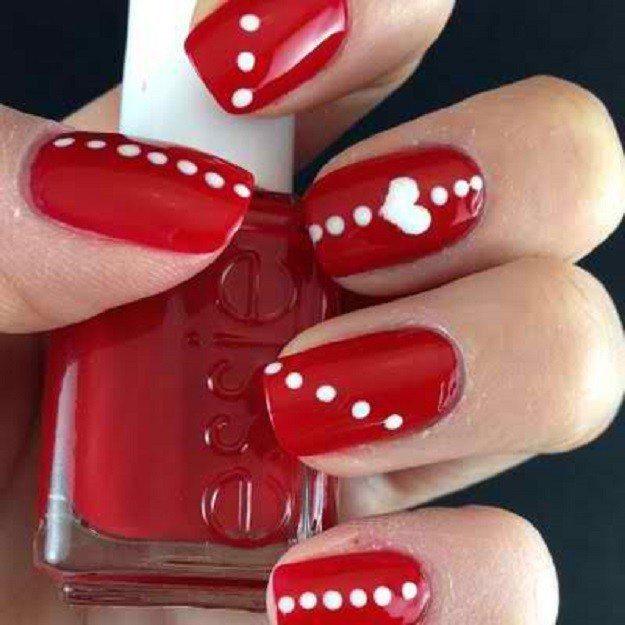 Por otro lado, los dibujos asimétricos son también tendencia, y de este modo, los podemos crear con lunares o puntos como en esta otra propuesta que vemos a continuación, con una base de esmalte en blanco y con puntos en color rojo o viceversa.