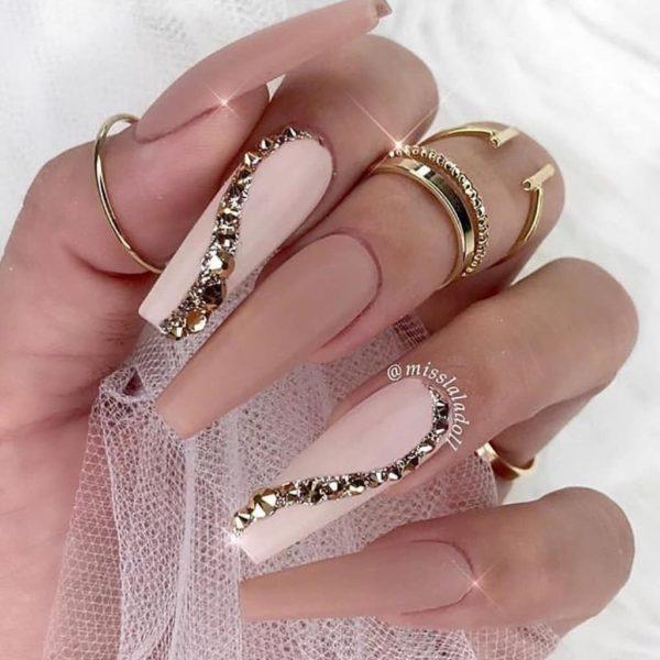 Los diseños de uñas permanentes 2020 se pueden adornar además con un detalle de piedras o de brillantes, que permitirán que vuestras uñas consigan un brillo especial. De este modo, podemos decantarnos entonces por un diseño como este, con un color nude o rosado, adornadas con unas pequeñas piedras a modo de detalle.