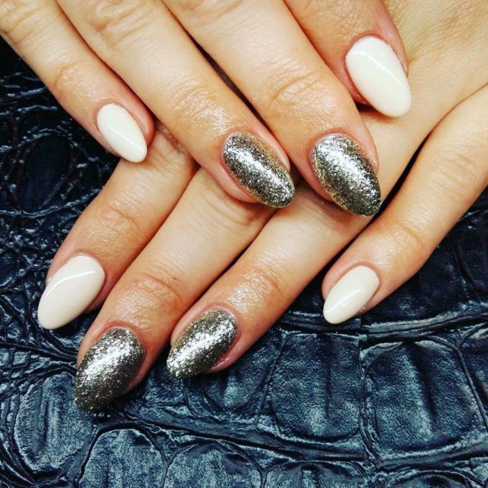 Y si lo que deseas es crear una auténtica combinación entre el brillo de uñas plateadas 2020, y la elegancia de un color más suave, como son los tonos nude, puedes elegir entonces diseños como este en el que se aplica un esmalte plateado, junto a otro que sea rosado nude.