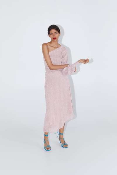 El vestido combinado a continuación, es otra de las propuestas de vestidos “midi” que Zara nos presenta para esta temporada. Un vestido que tiene además un ligero corte asimétrico y que acierta de pleno al presentarse en color rosa.
