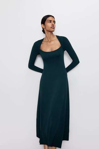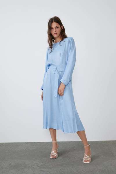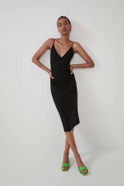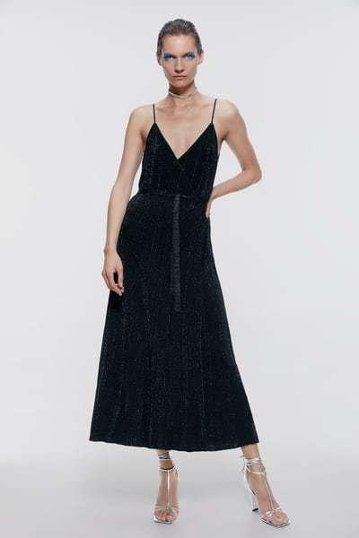 Tiempo ahora para los vestidos de fiesta midi Zara. Una línea que Zara siempre ha mimado cuidadosamente, y esta temporada no iba a ser menos. El primer ejemplo es este vestido fluido midi de escote pico y tirante de cuello. Con un espectacular escote en la espalda y línea evasé. Lo tienes por 49,95 euros.