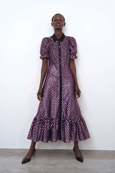 Y si quieres todavía algo más ecléctico, este vestido fluido de cuello redondo con volante y manga larga es para ti. Línea evasé, cortes con volante en la cintura y acabado con pompones de colores. Lo tiene todo. Y su precio es de 49,95 euros, por lo que está volando. Uno de los vestidos de fiesta para tallas grandes Zara que mejor ha caído esta temporada.