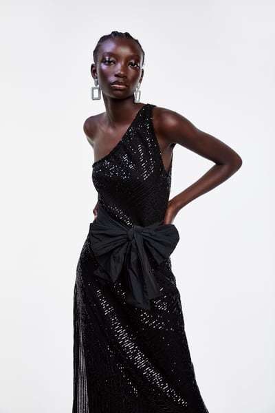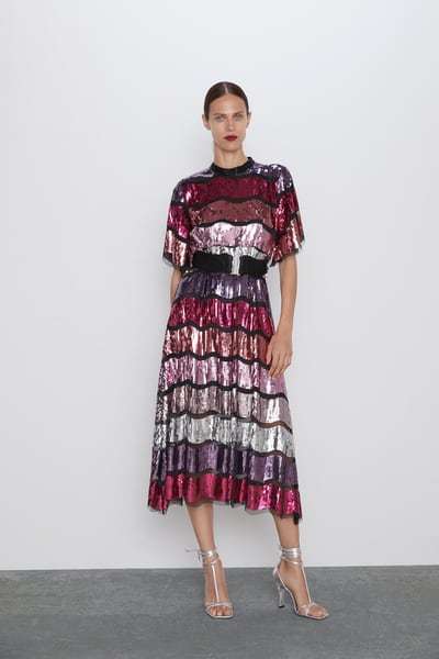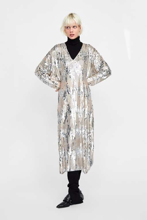 Los vestidos de lentejuelas serán también protagonistas en esta nueva temporada, de modo que no pueden faltar tampoco entre las propuestas de Zara. La firma apuesta por modelos variados, aunque nosotros hemos elegido mostraros este diseño, con manga larga, escote pico y obertura frontal.
