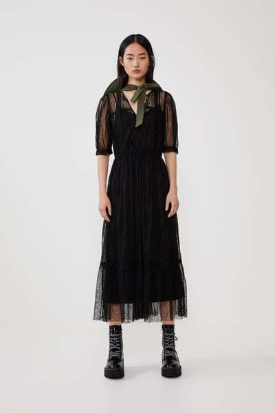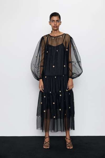 También queremos hablaros de vestidos de tul, que son tendencia como vestido para llevar a una boda esta temporada y que Zara nos presenta en modelos como este, con mangas transparentes, corte midi y además estampado de lunares.
