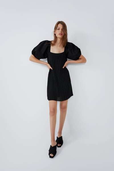 Los vestidos cortos son también protagonistas entre los Vestidos de fiesta Zara Primavera Verano de modo que podemos encontrar modelos como el vestido que veis a continuación, un vestido negro, que destaca no solo por ese diseño corto que mencionamos, sino también por el detalle de la manga abullonada.