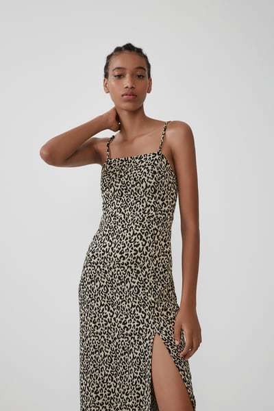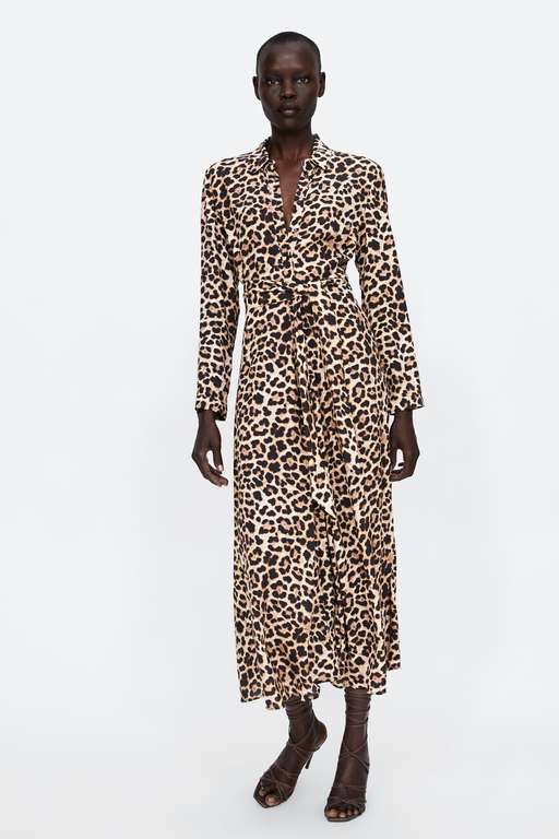 Y si quieres estar a la última, debes recuperar tu lado salvaje. Este vestido largo estampado animal print es tendencia. Modelo camisero de manga larga y con botón para cerrar los puños que se está vendiendo solo. Cierre delantero abotonado y lazada en la cintura. Todo por 39,95 euros en un súper ventas que no sorprende entre los vestidos de fiesta para tallas grandes Zara.