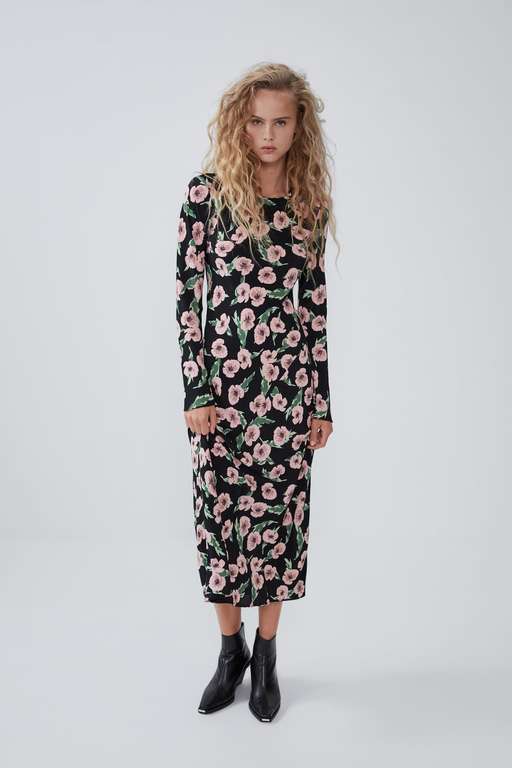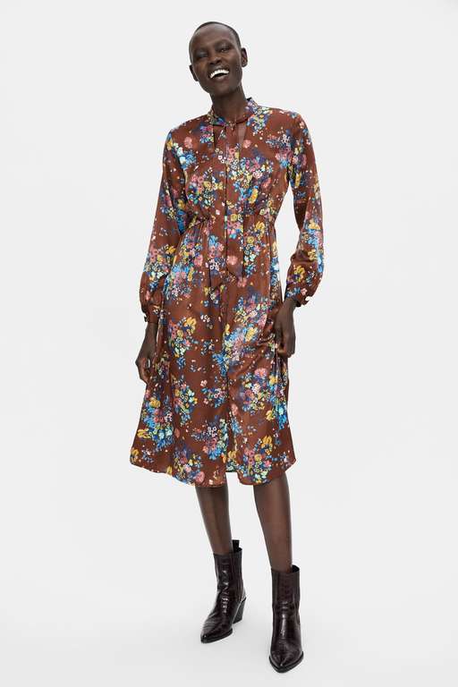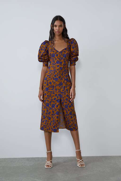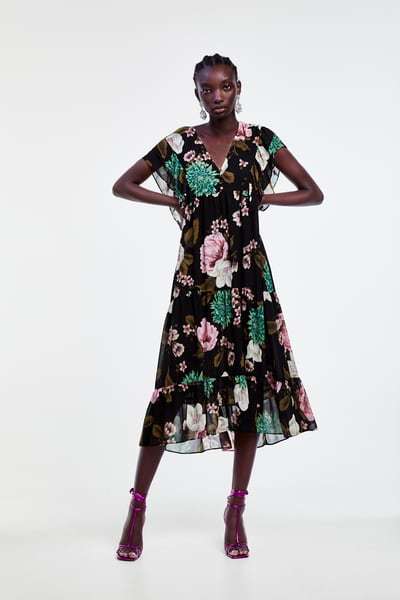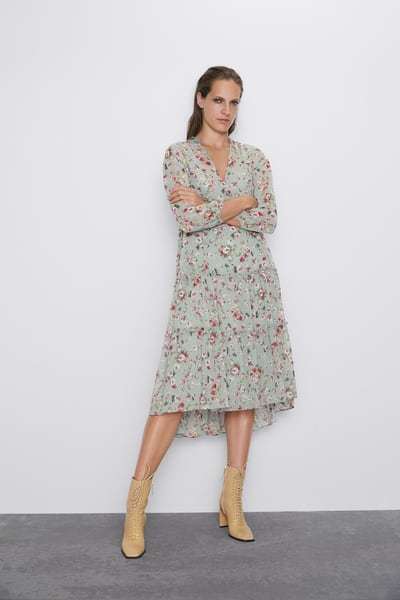 Volviendo a los clásicos, este vestido mido estampado floral es muy 70s. Diseño fluido con cuello subido con lazo y escote de pico. Manga larga, cierre abotnado delantero y fruncido en la cintura. El bajo, aunque no lo parezca, tiene una interesante abertura. Un toque remember a los vestidos de fiesta para bodas Zara por 39,95 euros.