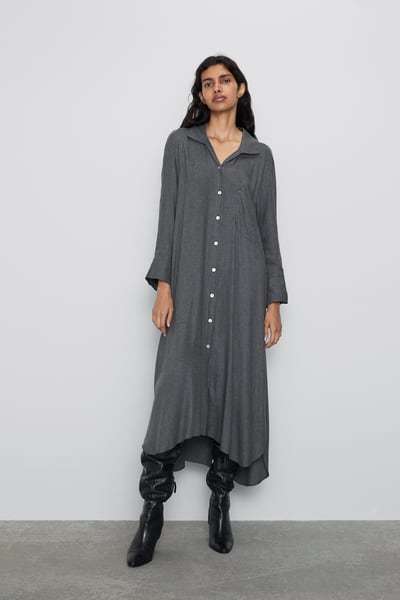 Terminamos con este dulce y elegante vestido camisero que encuentras entre los vestidos de fiesta para tallas grandes Zara .Por 29,95 euros, te llevas este modelo de cuello camisero tipo polo y manga larga. Botones y cinturón a juego, ideales para lucir piernas y taconazo. También quedan de maravilla con unas botas por encimad e las rodillas.