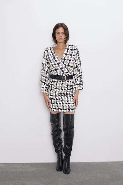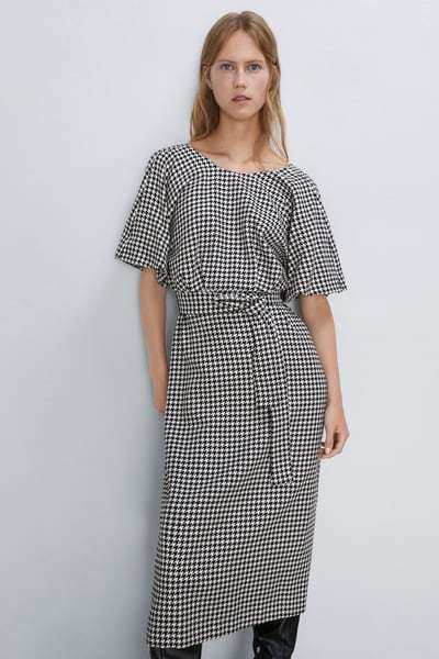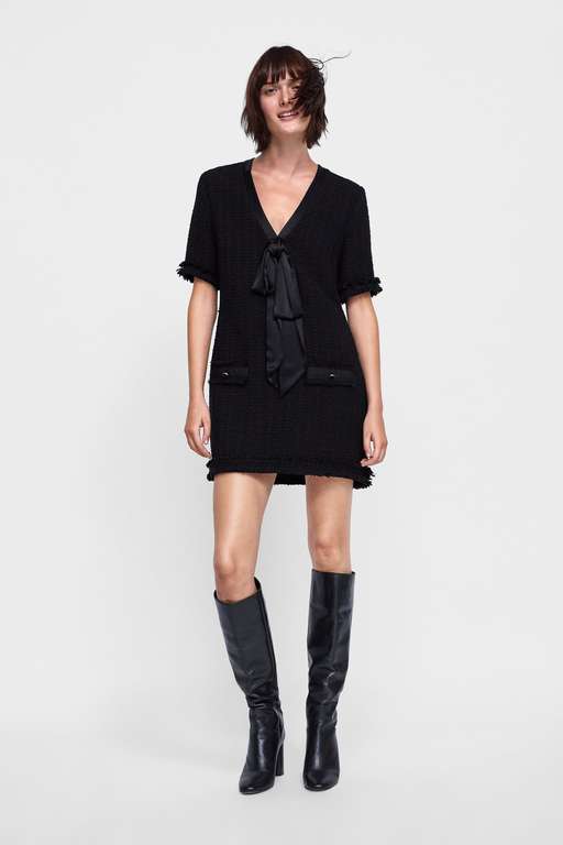 El último de los vestidos de fiesta para tallas grandes Zara que traemos es un remember de manual. Vestido tweed con detalle de lazo, que recuerda, y mucho, a finales de los 60. Vestido con escote de pico, adornado con un lazo y manga corta. Cuenta con bolsillos frontales pero son falsos y acabados deshilachados. Queda genial con unas botas y a las pruebas nos remitimos. Lo tienes por 39,95 euros.