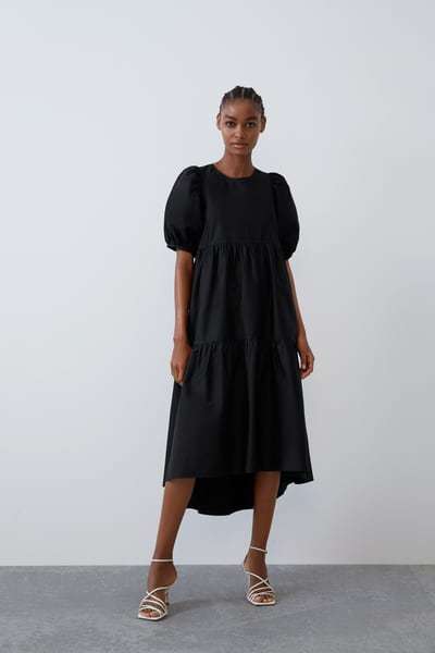 Si estáis invitadas a una boda, nada como elegir también uno de los modelos de Vestidos de fiesta Zara Primavera Verano como este que os mostramos. Un diseño de vestido negro, corto y que destaca además por tener un acabado ligeramente voleado y una pequeña manga abullonada.