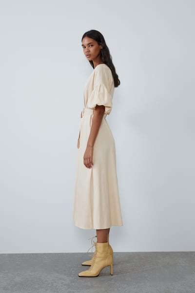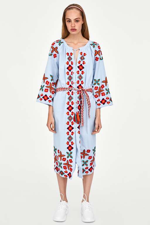 Sin solución de continuidad, tenemos este vestido midi bordado con un toque hippie. Amplia manga larga y detalles fruncidos en el escote. El cierre delantero es abotonado y con borlas. También incluye la lazada bordada en la cintura. Uno de los vestidos de fiesta para bodas Zara que más ha sorprendido y que está vendiéndose de maravilla. Cuesta 39,95 euros.