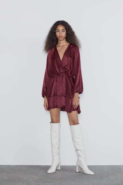 Otra opción de vestidos de fiesta Zara de día es el rojo satinado cruzado que tienes arriba.