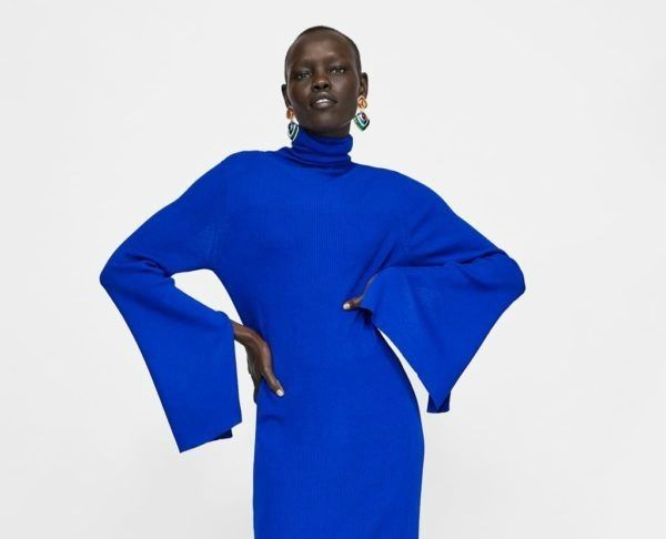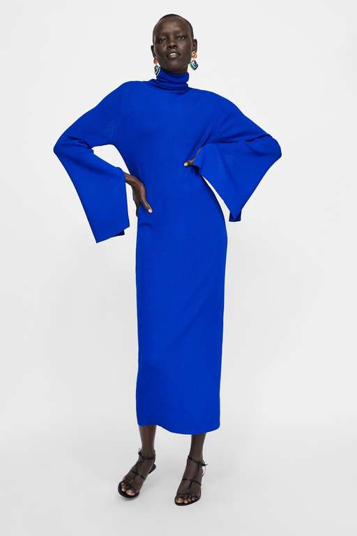 Pero si quieres un color más llamativo, nada como este majestuoso vestido largo de punto canalé. Majestuoso, con cuello subido y manga larga de línea evasé con abertura en la costura interior. Lo tienes disponible en negro y azulón y su precio es de 29,95 euros. Lógicamente, es uno de los vestidos de fiesta para bodas Zara más solicitados.