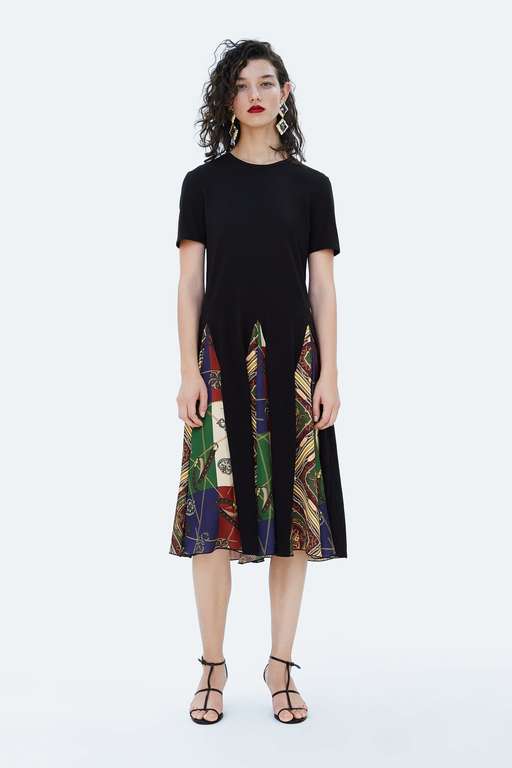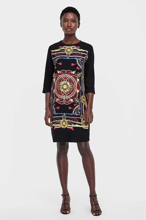 Porque a veces lo más sencillo es lo más práctico, este vestido combinado estampado y engomado seguro que te sienta genial. Cuello redondo, manga por debajo del codo y un dibujo tipo Versace para enamorar. Lo tienes disponible en rojo y en negro por 19,95 euros. Uno de los vestidos de fiesta para tallas grandes Zara más económicos.