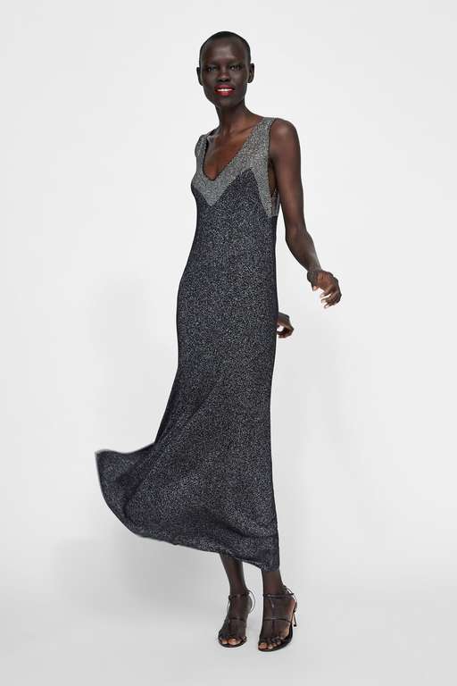 Pasamos ahora a echar un ojo a los vestidos de fiesta para bodas Zara. Con un precio más que competitivo, la firma insignia de Inditex ofrece modelos para todos los gustos. Y una muestra la tenemos en este espectacular vestido largo de hilo metalizado de escote pico y tirantes anchos. Lo tienes en color gris antracita, uno de los tonos que es tendencia esta temporada, por 39,95 euros.