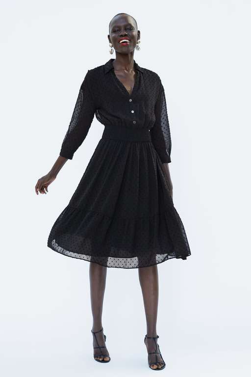Terminamos el repaso a los vestidos de fiesta para bodas Zara con este vestido Plumeti elegante y sensual. Un diseño semitransparente con cuello solapa y escote de pico. Además, tiene manga larga, cintura elástica y línea evasé amplia con el bajo acabado en volante. Lo encuentras por 39,95. Eso si lo encuentras.