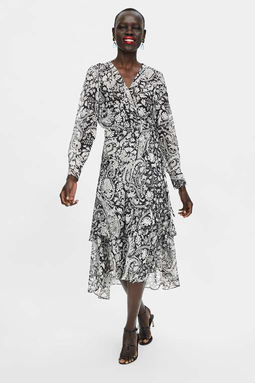 Y sin salir de los estampados, entre los vestidos de fiesta para tallas grandes Zara encontramos este vestido largo fluido maravilloso. Modelo fluido con escote de pico y manga larga. Tiene forro interior, ideal para la temporada, el bajo es asimétrico y terminado en volante. Además, el cierre es cruzado tipo pareo con lazo a juego con el tejido. Lo tienes por 49,95 euros.