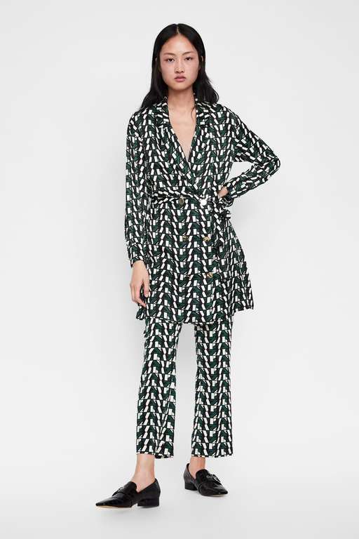 Pasamos ahora a los vestidos de fiesta para manga larga Zara y lo hacemos con este espectacular vestido estampado. Diseño fluido de cuello solapa y manga larga. Tiene bolsillos a los lados y el cierre es cruzado con botones metálicos y cinturón a juego. Su precio es de 39,95 euros.
