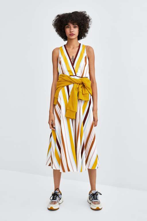 Siguiendo la tónica colorida de los vestidos de fiesta para bodas Zara este vestido midi a rayas. Un modelo con escote de pico y tirantes cruzados en la espalda con una lazada. El cierre es trasero y de cremallera y cuenta con bolsillos laterales. Es uno de los top ventas de la temporada. Su precio está en 29,95 euros y tiene mucho que ver en este exitazo.